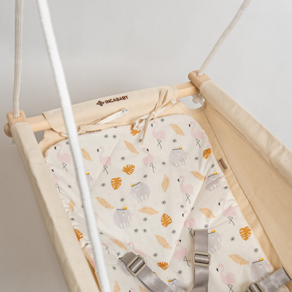 The Incababy Comfort baby swing ensures your little one's maximum safety with its built-in 5-point safety harness. Important: the safety harness is standard equipment for the swing, so there is no need to purchase it separately. With skill-developing beechwood beads and a cube, and a stylish - cut-out rhombus-shaped beechwood spacer.