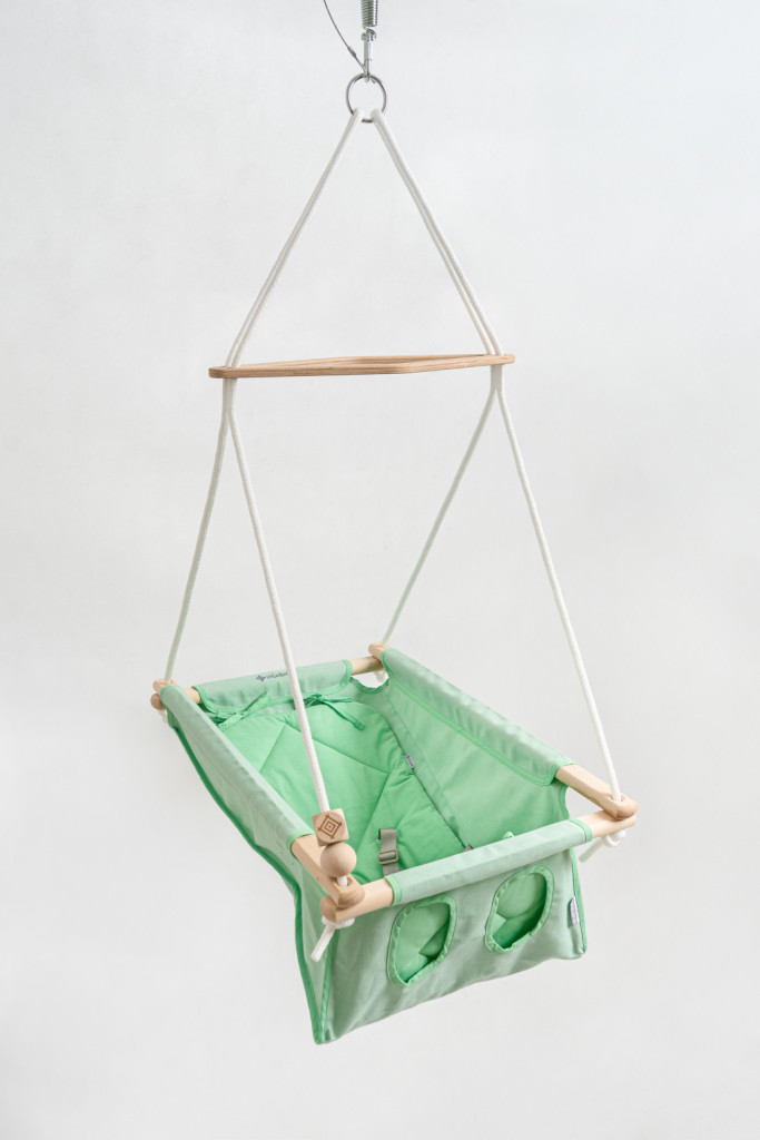 In this special indoor baby swing, the baby can rest while lying and play while sitting. If you add a spring, you can rock your child not only sideways, but up and down as well.