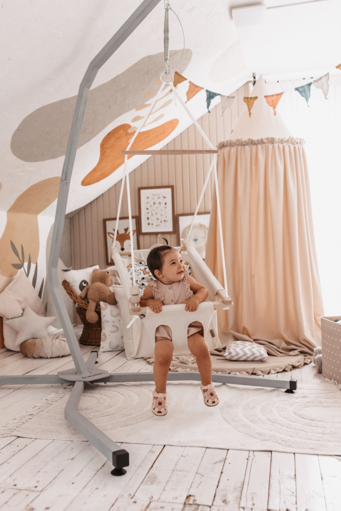 The swing is a comely showpiece at home and in the baby's room, it follows the latest trends and meets today's requirements maximally.