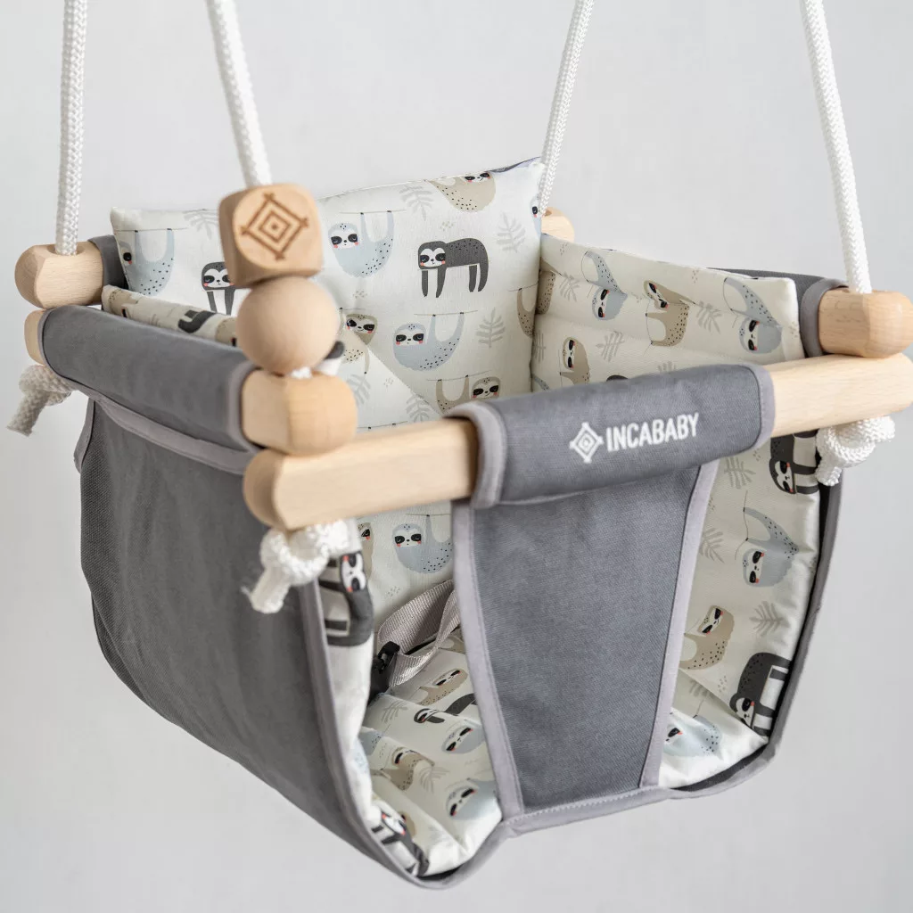 The Incababy Premium junior swing INCLUDES a velcro swing liner, a 2-point safety harness, skill-developing beech wood ball and cube, a padded sleeve, and adjustable swing ropes.